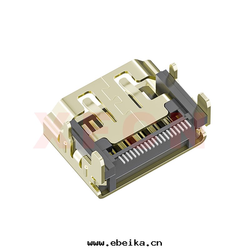 描述:HDMI-19pin,母座,铁(tiě)殼(ké)镀金(jīn),四腳(jiǎo)插,SMT